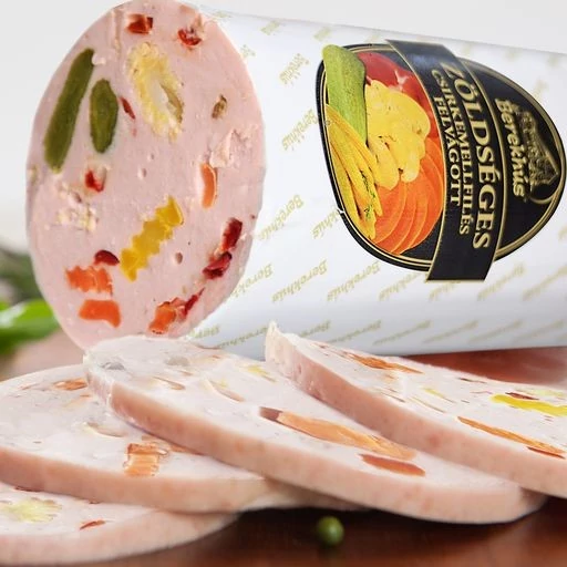 Összetevők Csirkemellhús (bader) 50%, Zöldségek 24% [változó arányban - sárgarépa, paprika, kukorica, gomba, csemege uborka -, ivóvíz, ecetsav (E260), étkezési só, tartósítószer (E211), szilárdító anyag (E509), antioxidáns (E330), édesítőszer (E954), aroma, mustármag], Ivóvíz, Szójafehérje, Pác-só keverék [étkezési só, tartósítószer (E250), csomósodást gáltó anyag (E535)], Páckeverék [dextróz, sűrítő anyagok (E407a, E412), emulgeálószerek (E450, E451), antioxidáns (E316), burgonyakeményítő, ízfokozók (E621, E635)], Burgonyakeményítő, Sűrítő anyagok (E407, E425), Fűszerkivonat, Emulgeálószer (E1450), Fűszerek, Színezőanyag (E120), Antioxidáns (E316)
